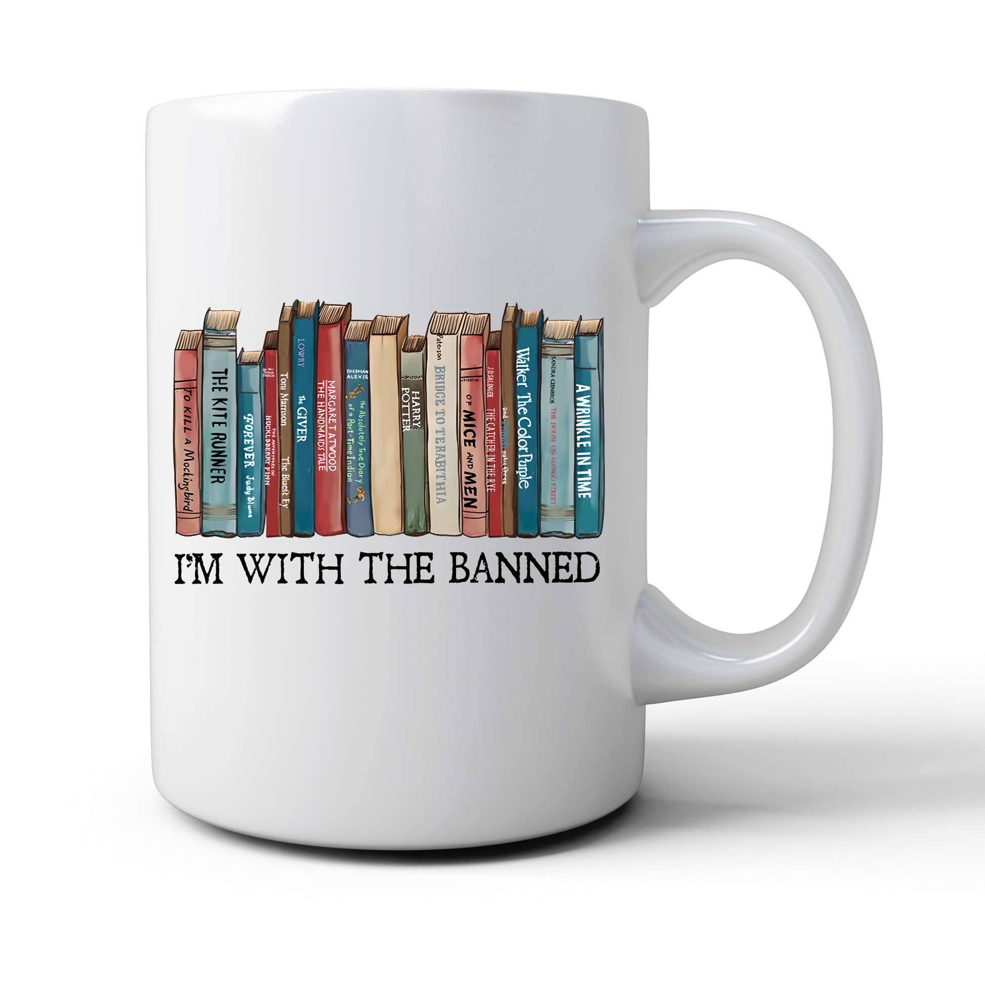 15 oz White Ceramic Mug. Double printed with design on both left and right of handle.