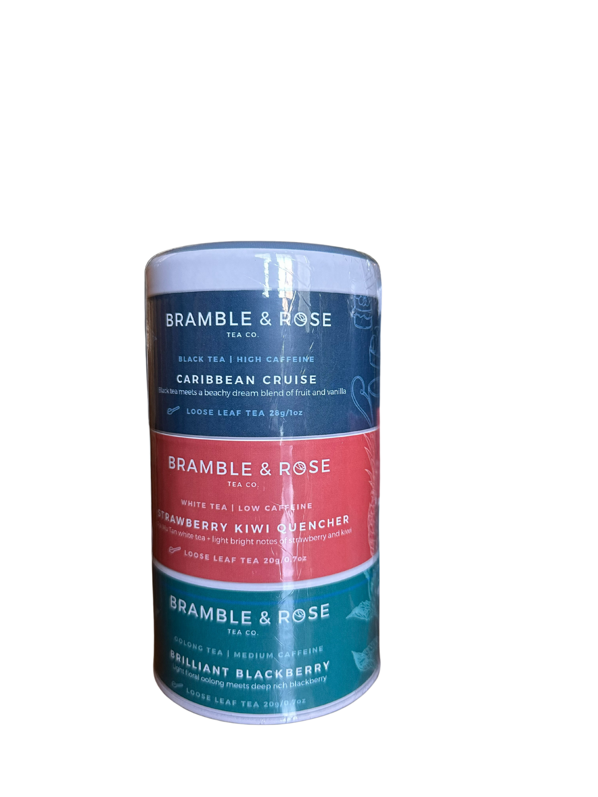 Bramble & Rose Tea Co.'s Variety Sampler...2.0! Our Sunshine Collection offers 3 unique teas that will keep you cool and refreshed all Summer long! We can't forget about the fabulous hand held steeper we've included as well. Each tea makes 10 cups and can be steeped a second time. A great gift or treat for yourself!